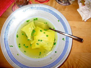 All those delicious smells inspired plaintive cries of hunger from my brood. So we found a little stube close by with an extremely friendly waitress (one in an uninterrupted series here). Quinn decided on soup: lebenspåtzlesuppe, to be exact. We both thought that would mean a soup with spatzle dumplings in it. When the soup arrived, I remembered that leben means liver. The dumplings were little meat, um, liver dumplings. Motherly discretion meant I said nothing, and Quinn thoroughly enjoyed it, exclaiming over how delicious it was.